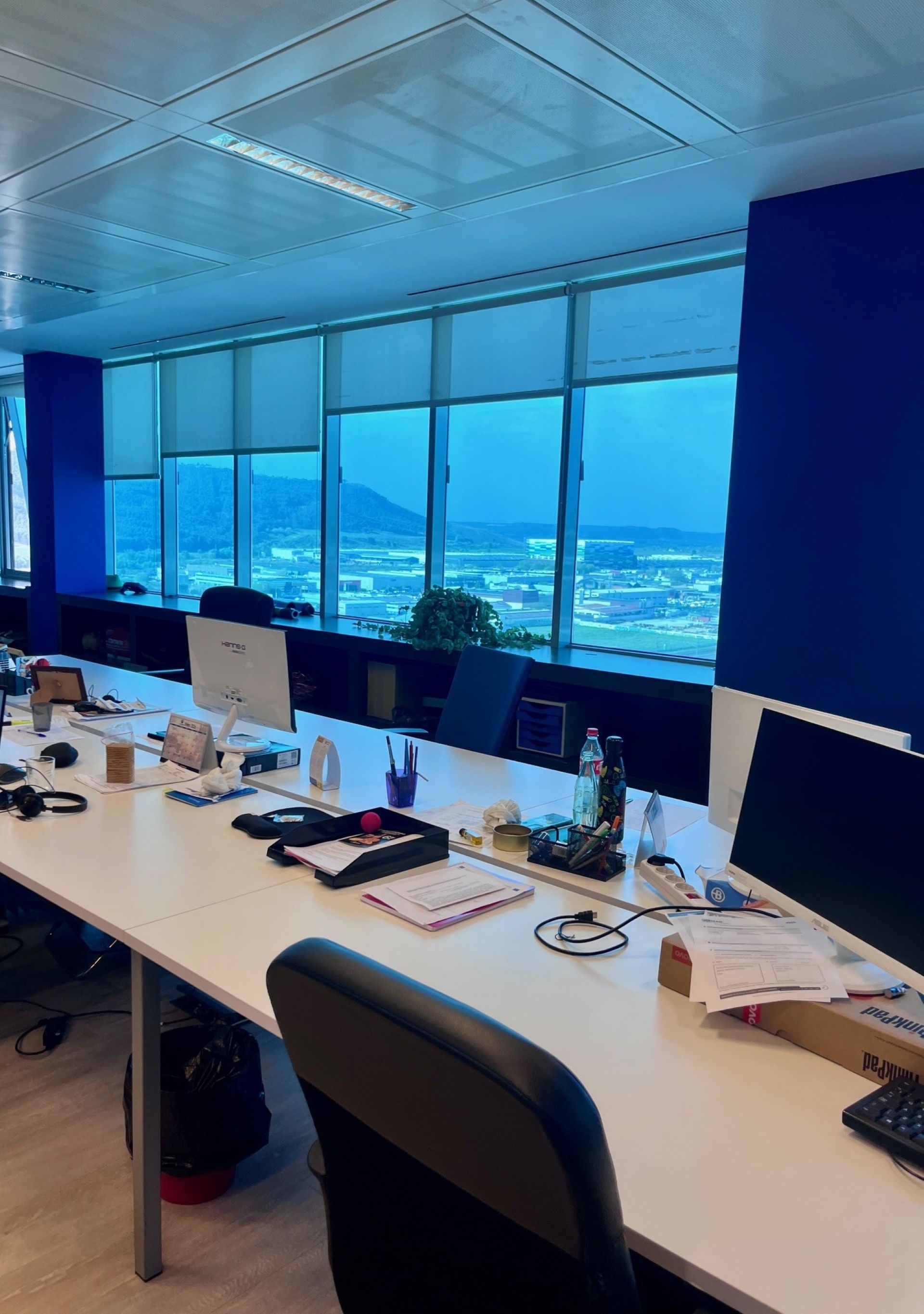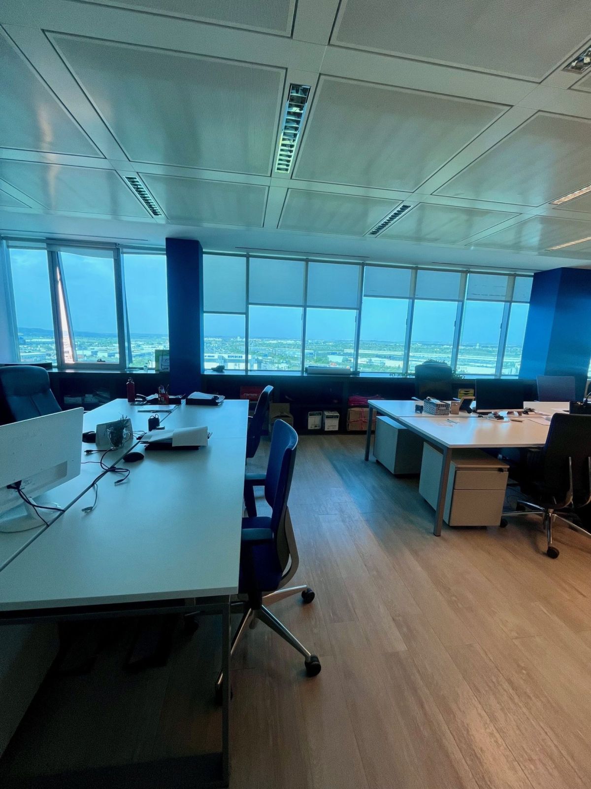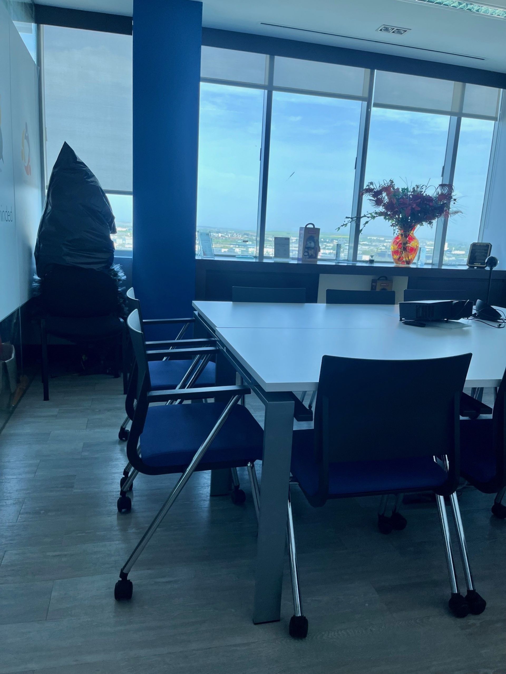 Professional workspace located on the 11th floor of Torre Garena (Alcalá de Henares), a landmark corporate building in the Henares corridor. The office spans 245 m² and features floor-to-ceiling windows throughout, ensuring abundant natural light and open views of Madrid. The space is designed for a flexible, mixed-use model, combining individual workstations with the option to rent entire spaces on specific days of the week, particularly Mondays and Fridays.