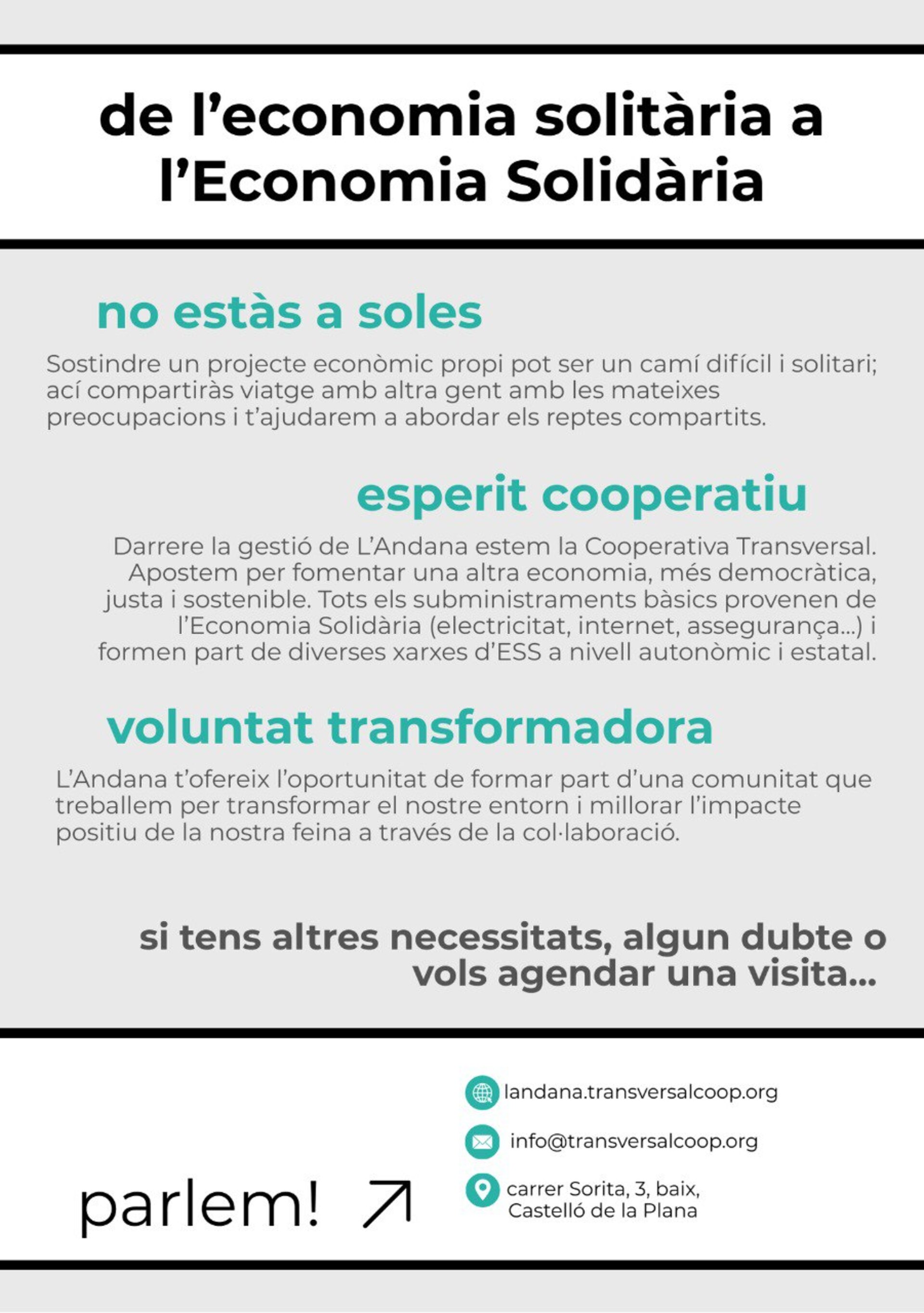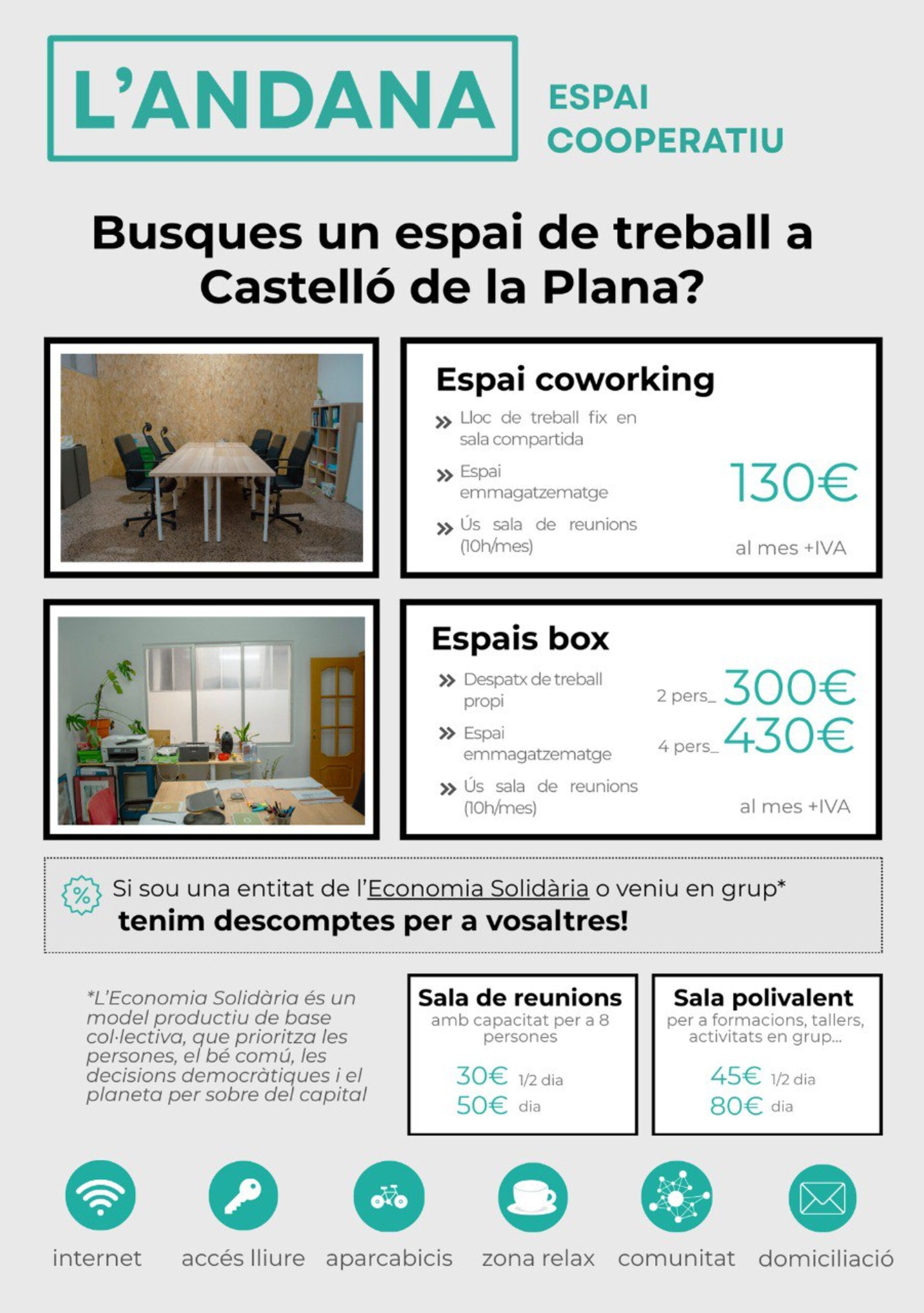L'Andana is a cooperative and coworking space located in Castelló de la Plana, in the Crémor neighborhood. It is designed to promote projects linked to the social and solidarity economy and foster collaboration among individuals, cooperatives, and collectives. At L'Andana you will find: - coworking spaces for freelancers or projects - meeting and training rooms - support and training for cooperative initiatives - activities and projects linked to the neighborhood and the social economy. Our goal is to promote a different way of doing economics, based on values such as cooperation, sustainability, solidarity, and participation.