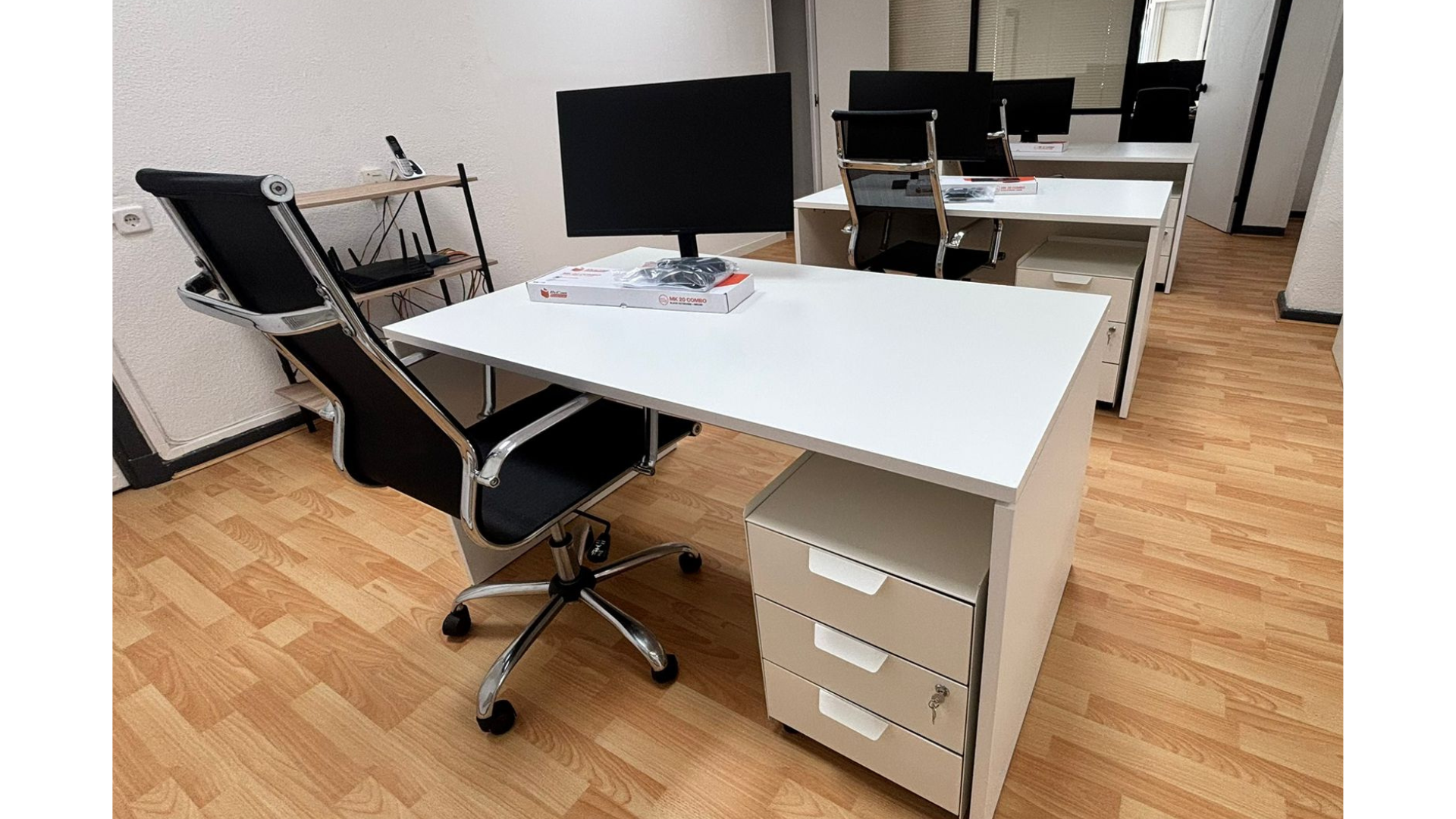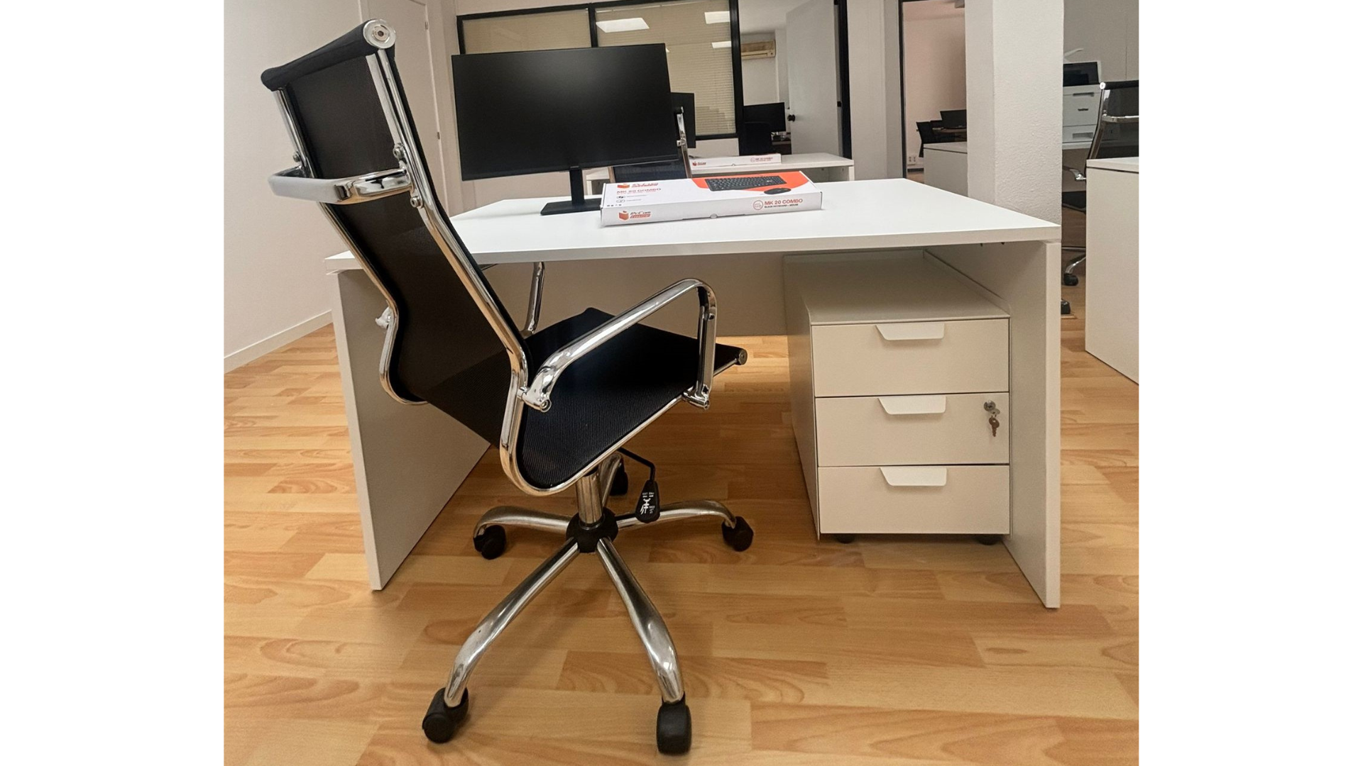 +Estación de trabajo completa, cada puesto cuenta con una mesa amplia de 80x140 cm, silla ergonómica y cajonera con llave para mantener tus documentos seguros. Equipados con: Monitor 27'', teclado, raton y material de oficina.