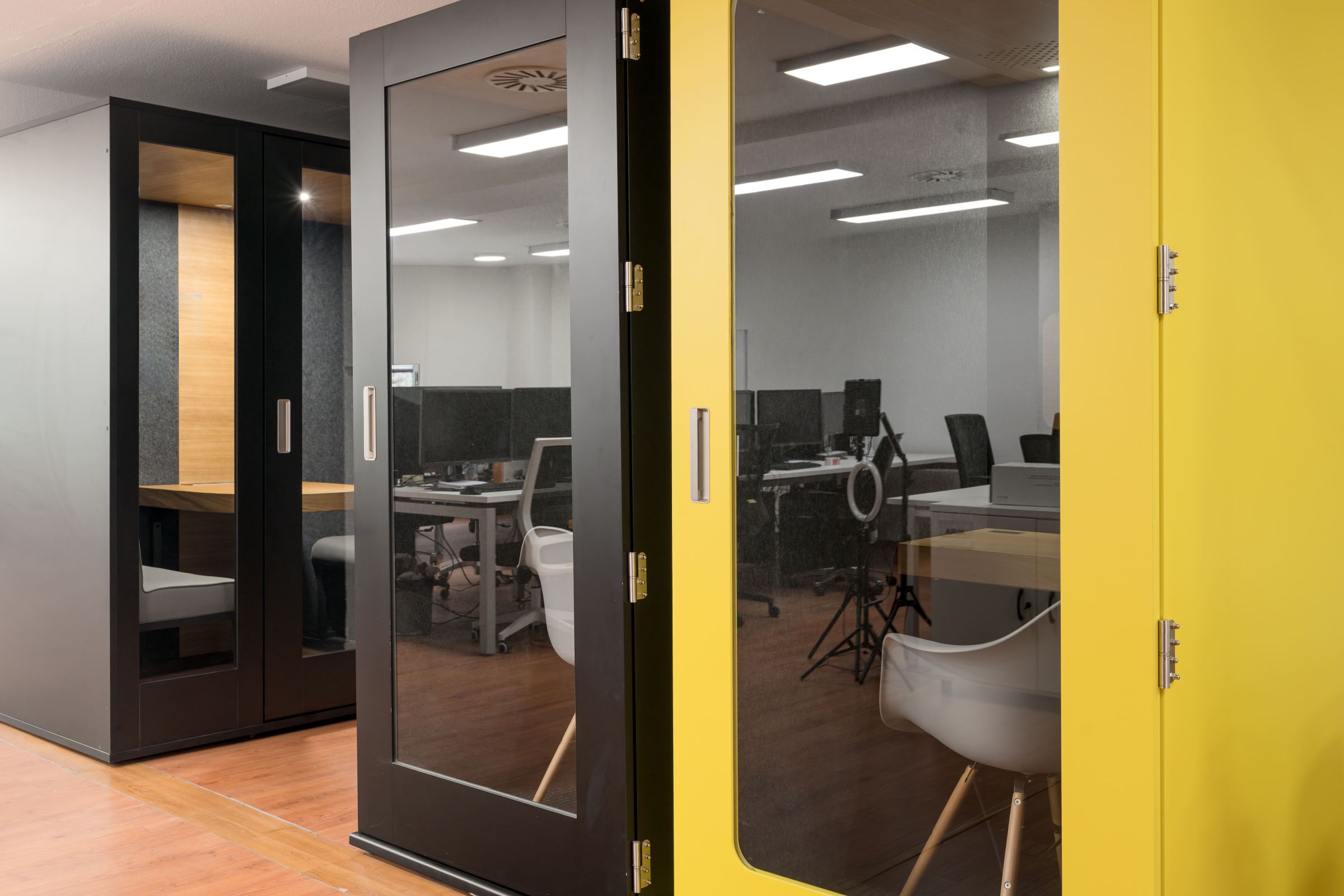 LIVINKL es un espacio de dos oficinas enfrentadas (280m2 cada una), con 80 puestos de trabajo, 3 salas de reuniones acristaladas (para 6, 8, 10 personas), 6 cabinas insonorizadas (5 individuales y una para 4), un comedor para 25-30 personas, dos zonas de café y un mini-gimnasio...